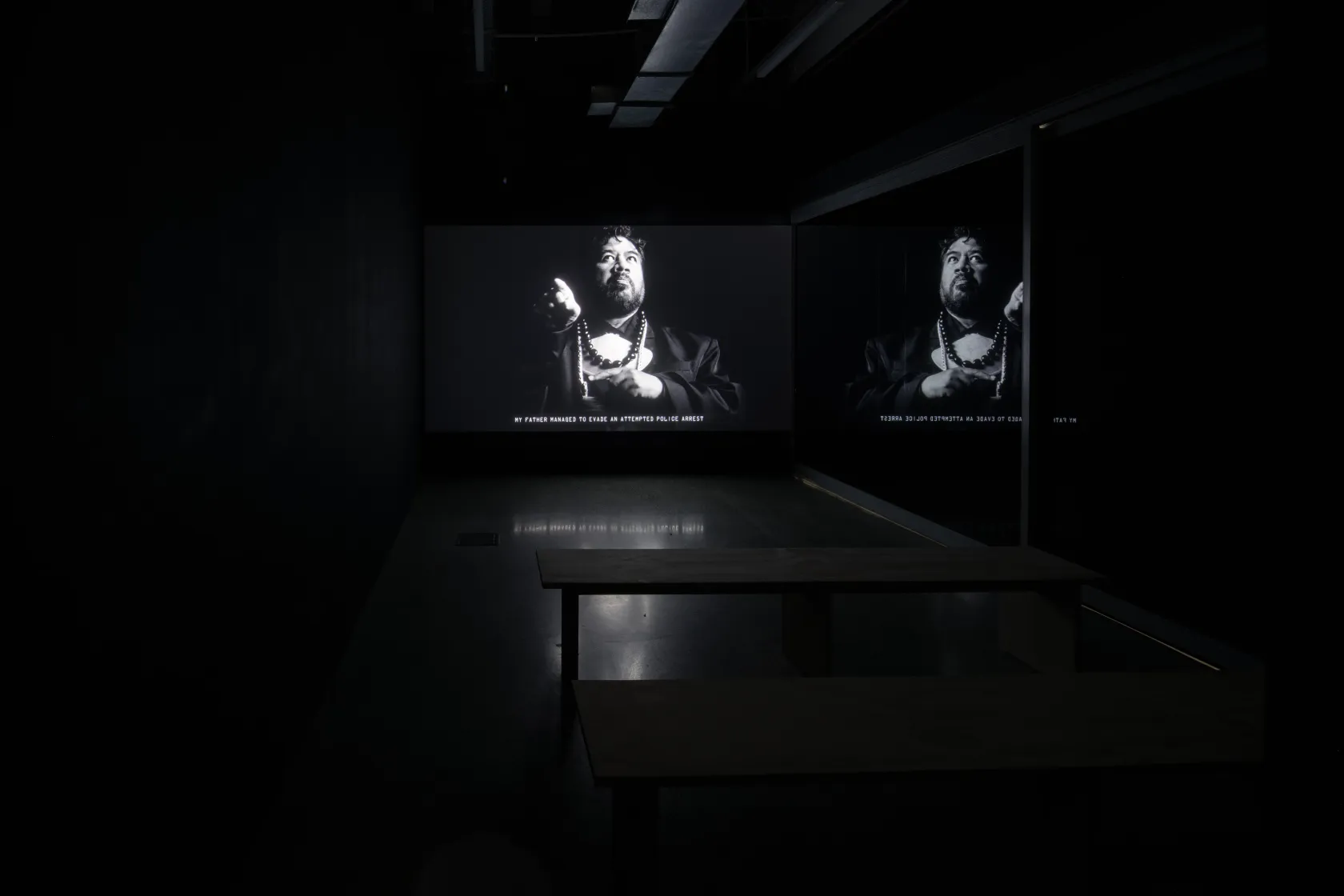 B42040A1A1A is a solo exhibition by Fijian New Zealand artist Luke Willis Thompson. The installation focuses on two major moving image artworks developed over the past three years, which each imagine a decolonial future for Aotearoa through the visual language of political theatre.