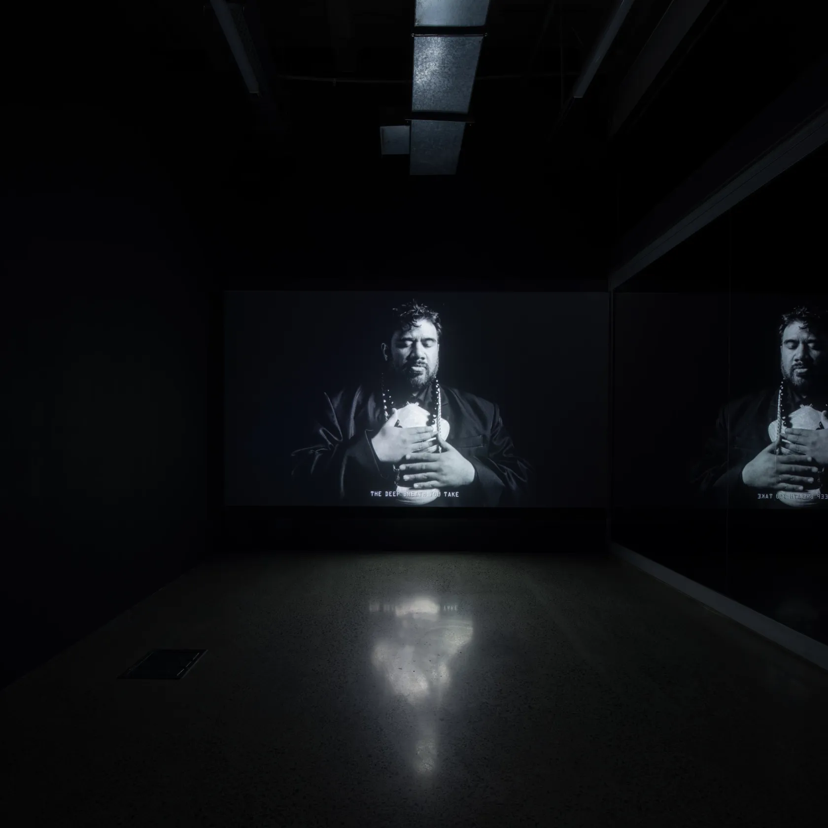 The exhibition is also the inaugural presentation of a new work in this series, which is similarly set in a not-too-distant future. Named after the i soro, a traditional Fijian model of reconciliation, Soro (2025) envisions a reenactment of the 2021 Dawn Raids Apology. Filmed in analogue black and white 35mm film, Thompson creates a dream-like atmosphere where an inferred yet unnamed Prime Minister delivers the speech out of frame. The camera focuses entirely on recognised NZSL interpreter Alan Wendt, who delivers and performs the address in Aotearoa's third official language. Set ten years after former Prime Minister Jacinda Ardern’s apology, Thompson's film imagines a bold and expansive set of reparations, including comprehensive compensation for victims of the raids, unrestricted travel for Pacific people to and from Aotearoa, and reparations for harms caused by climate change.